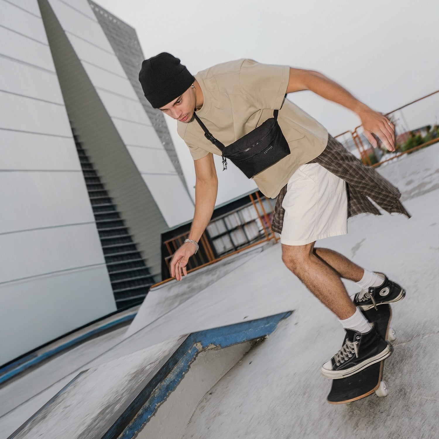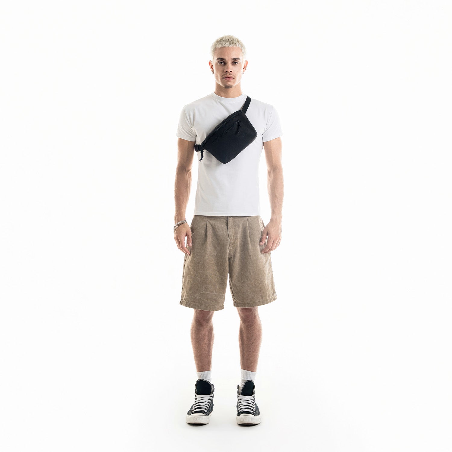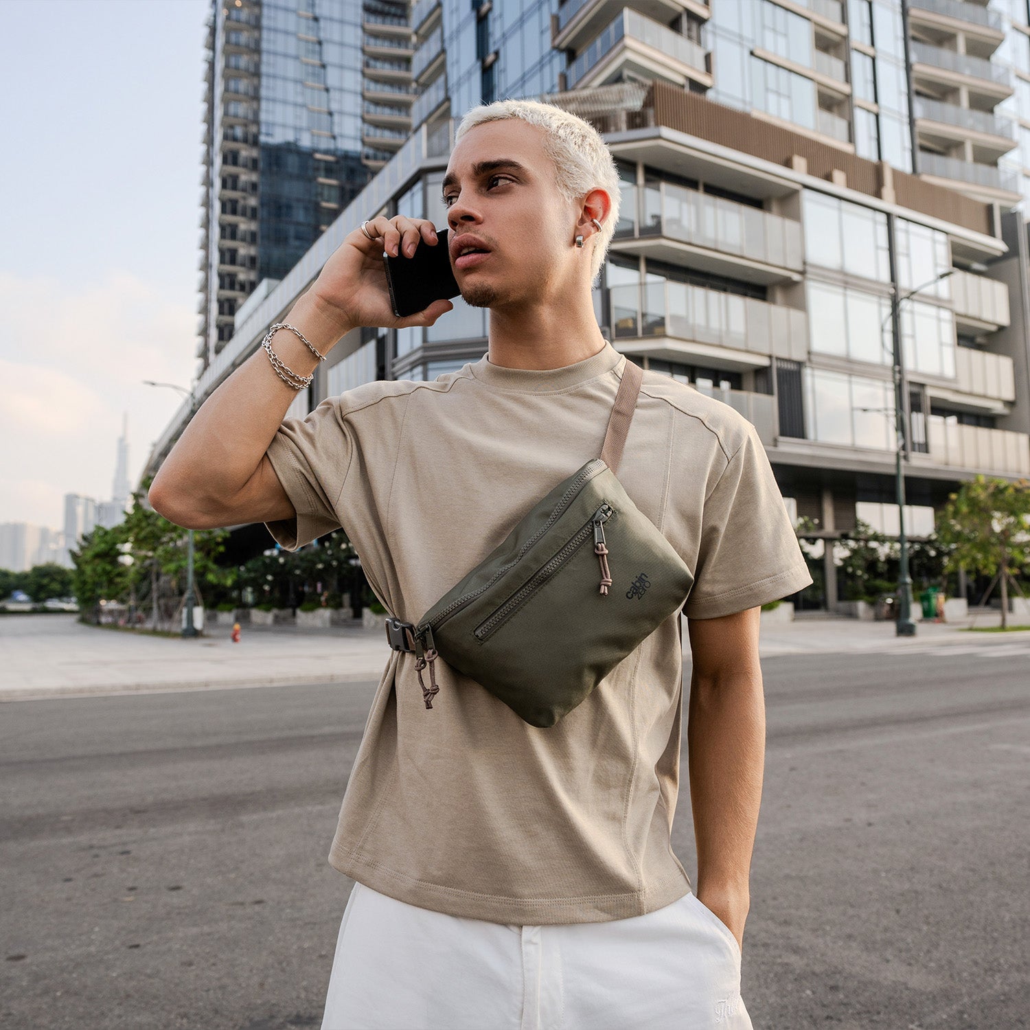 Our fresh take on a hands-free travel shoulder bag with a new design and recycled materials.
